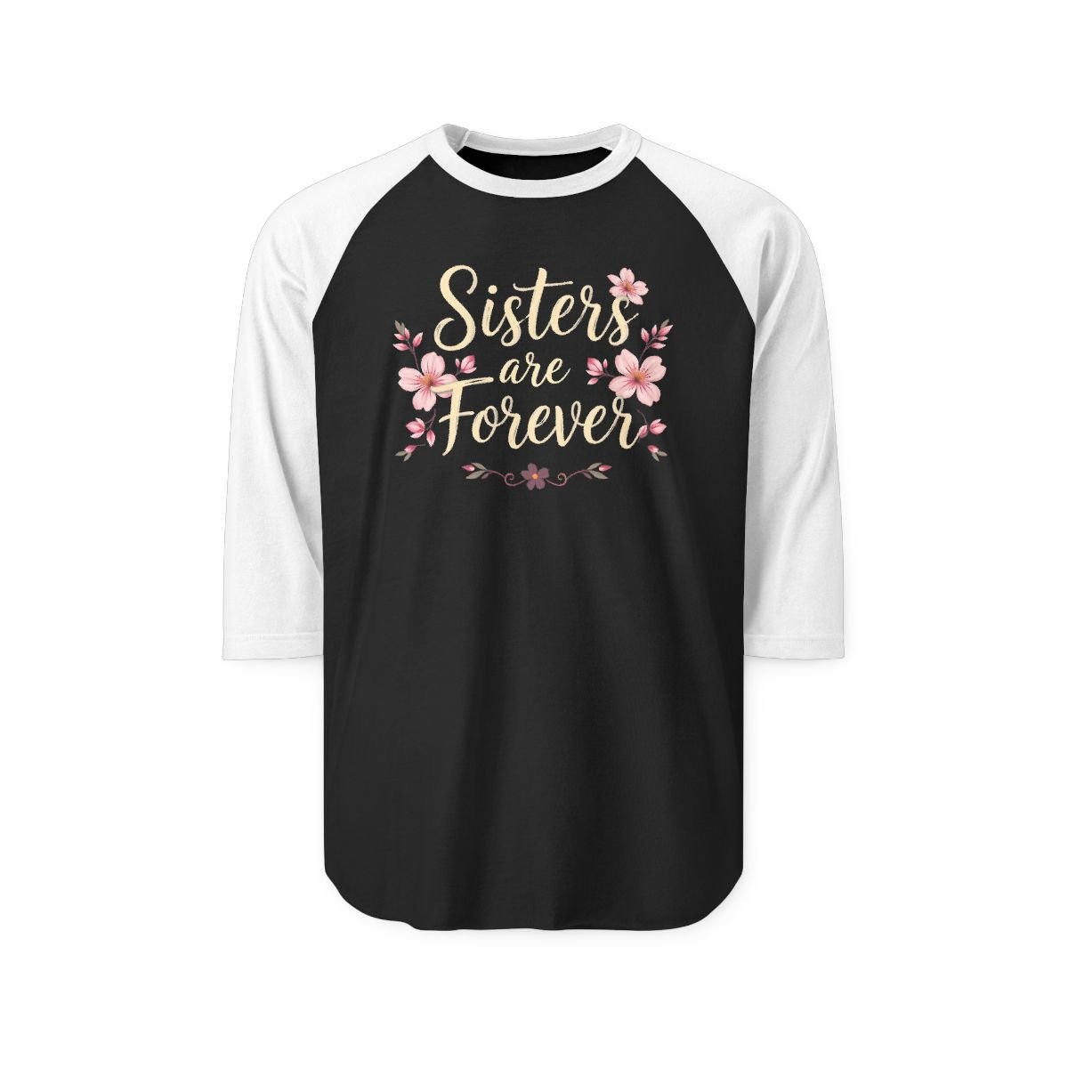 A stylish Unisex Three-Quarter Sleeve Raglan Shirt, the perfect blend of comfort and style. It features the heartwarming message 'Sisters are Forever' making it perfect for celebrating the unbreakable bonds between sisters.